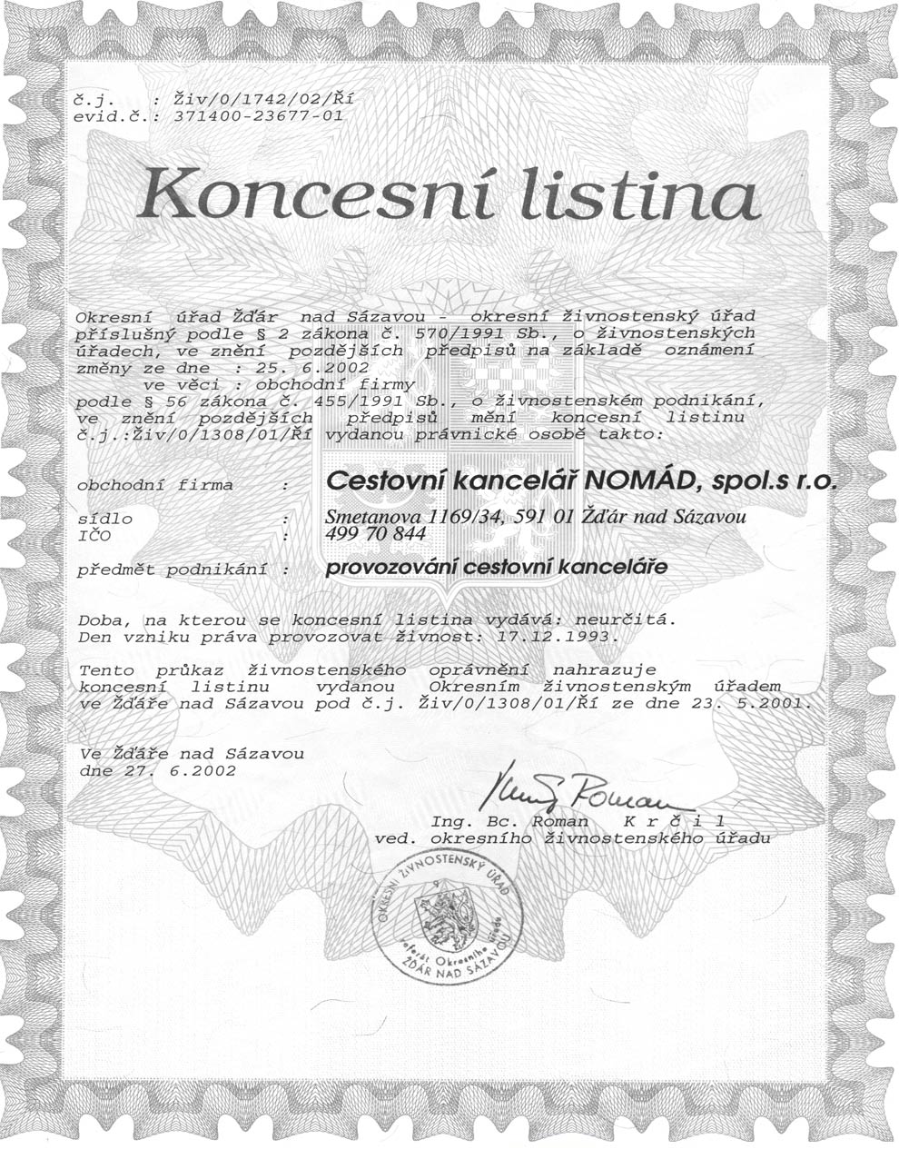 Pro ověření našeho podnikání je zde k dispozici naše KONCESNÍ LISTINA Stáhnout