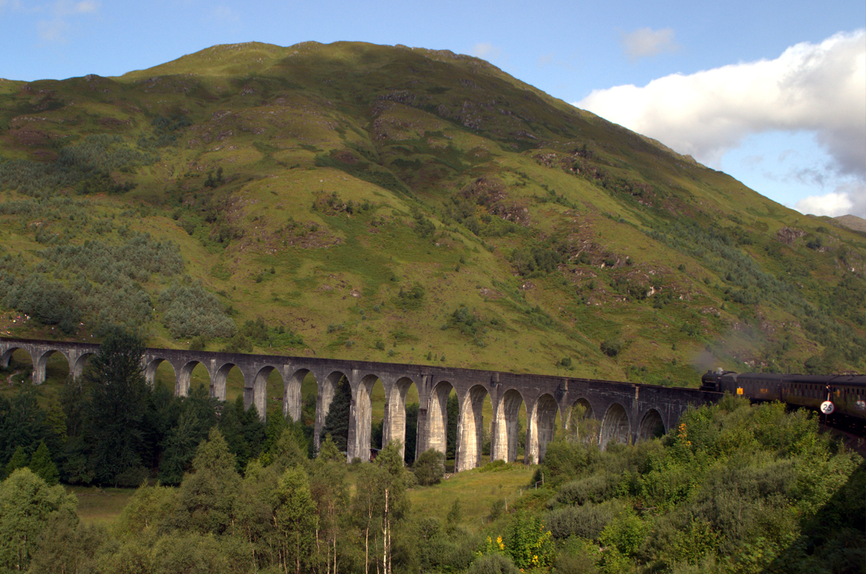 Ráno se vydáme do městečka Fort William. Dále pak můžete vyrazit vlakem Harryho Pottera přes proslulý Glenfinnanský viadukt do městečka Mallaig (klienti, kteří nemají zájem o fakultativní jízdu vlakem, tuto cestu absolvují – po jiné trase – autokarem). Při této cestě, krátká zastávka u Neptunových schodů. Neptunovy schody jsou soustavou osmi zdymadel na Kaledonském kanále, který spojuje západní a východní pobřeží Skotska. Dále krátká zastávka v městečku Arisaig, bývalém výcvikovém středisku speciálních jednotek, u památníku československých vojáků bojujících v Británii. Přejezd na ostrov Skye. Odpoledne pak zamíříme k jednomu z nejkrásnějších skotských středověkých hradů Eilean Donan Castle. Hrad patří mezi nejnavštěvovanější místa Skotské vysočiny. Večer ubytování v hotelu, večeře.