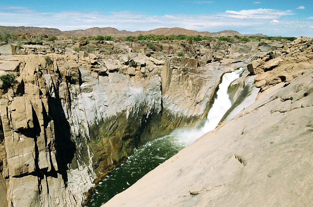 Skalnatá poušť, kaňon řeky Orange, kde dunící vody padají přes okraj příkrého srázu a vytvářejí jeden z nejkrásnějších světových vodopádů.