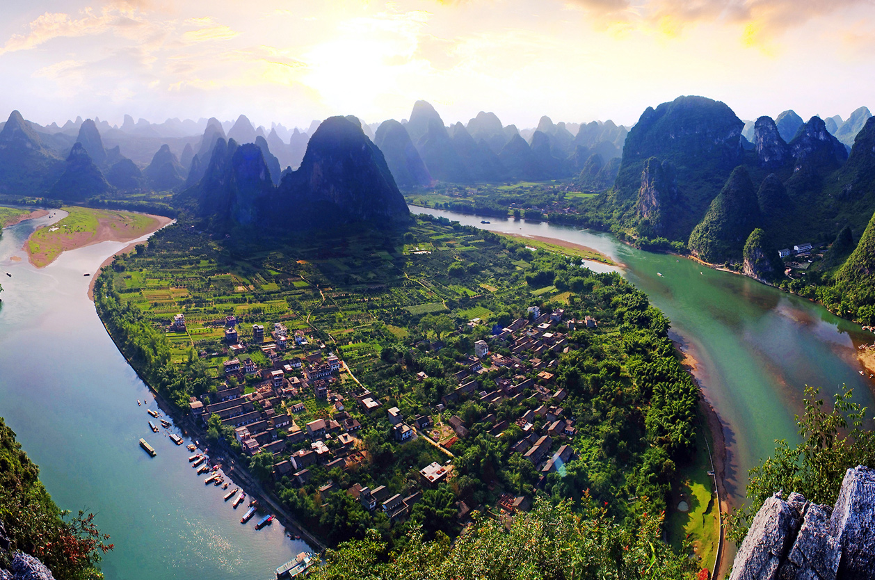 Přes metropoli čínských gurmánů Kanton (Guângzhou) na Perlové řece do Kuej-linu, dle samotných Číňanů „nejkrásnějšího místa na světě“. Krasové scenérie, jeskyně Rákosové flétny. Lung-šeng (Longsheng) – nejslavnější čínské rýžové terasy s impozantními políčky, vytvořenými na strmých, několik set metrů vysokých svazích hor. Návštěva speciální čajové farmy. Jang-šuo (Yangshuo) – kraj světoznámých vápencových homolí. Výlety po okolí – pěšky či na pronajatých kolech: jeskyně, domorodé vesničky s trhy, rybáři lovící pomocí cvičených kormoránů. Pro zájemce výlet lodí po řece Li-ťiang.