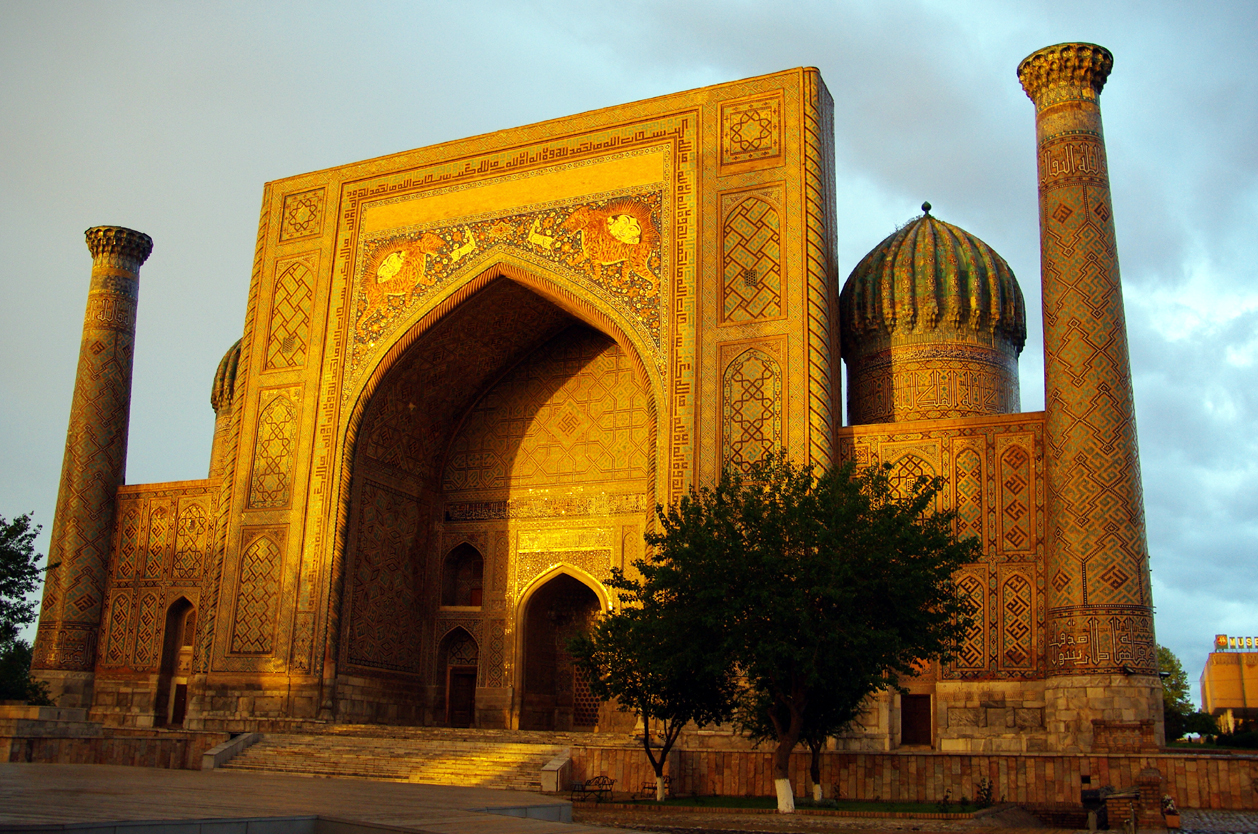 Přejezd vlakem do klenotu světové architektury – legendárního Samarkandu (UNESCO): náměstí Registán se třemi madrasami, obří mešita Bibi Chánum, tyrkysový komplex mauzoleí Šahi Zinda, mauzoleum obávaného dobyvatele Timura Lenka (Tamerlána) a jeho osvíceného vnuka, Ulugbekova observatoř. Ruiny starověkého Samarkandu, muzeum Afrosiab, sarkofág s údajnou 18 m rukou proroka Daniela, pestrý bazar Siab. Výlet přes hory do Tamerlánova rodiště Šahrisabzu (UNESCO): portál Bílého paláce, mešita Kok Gumbaz, mauzoleum Timurovců.