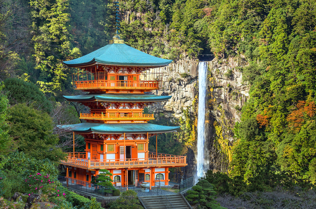 Přejezd na jih poloostrova Kii, největšího na Honšú, se čtyřmi památkami UNESCO. Lázně Kacuura: koupání v otevřených termálech rotemburo na pobřeží, vyhlášený rybí trh s ranními aukcemi tuňáků. Taidži: muzeum velryb (s prodejem velrybího masa) nebo případně možnost vyjížďky lodí za velrybami (bez harpun!). Kratší procházky po Kumano Kódó, tisícileté poutnické stezce pod mohutnými cedry (UNESCO) a k nejvyššímu japonskému vodopádu – impozantnímu Nači (133 m). Ohňový festival Nači-no-Hi, jeden ze tří nejobdivovanějších v celém Japonsku. Návrat do Ósaky po západním pobřeží poloostrova Kii.