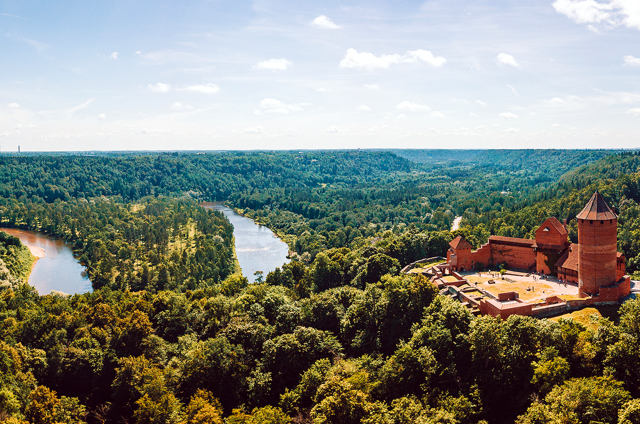 Prohlídka města, paláce a starého hradu v Siguldě a cyklotrasou „Lotyšským Švýcarskem“ v N.P. Gauja údolím pískovcových skal k dominantě hradu Turaida. Dechberoucí výhledy na údolí řeky Gauja. Gutmana ala – největší jeskyně Pobaltí. K romantické zřícenině hradu Krimulda a dále červenou cyklotrasou podél řeky na západ, nebo možnost plavby kaňonem řeky Gauji na loďkách, pro zájemce lanovka nad údolím řeky.