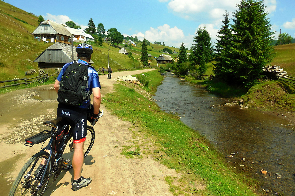 Na kolech přes vesničky Nižnij a Věrchnij Studenyj do Lvovské oblasti do sedla Beskid na bývalé československo-polské hranici. Přes Skotarske do Volovce a zpět (lehčí varianta s Ozero Vita, koupání).