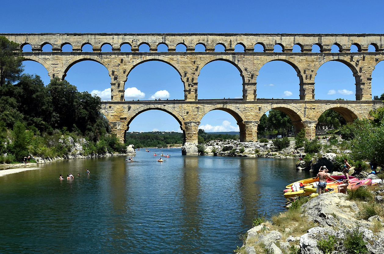 Busem k řece Gardon do městečka Collias. Na kolech kolem vinic před Uzés k římskému třípatrovému akvaduktu Pont du Gard (UNESCO). Možnost koupání a dále do Remoulin. Autobusem do Avignonu. Prohlídka historické části města, Papežského paláce, mostu Benézet atd. Autobusem do Cassis na Azurovém pobřeží, pěší turistika okolo zálivů v N.P. Calanques, možnost koupání.